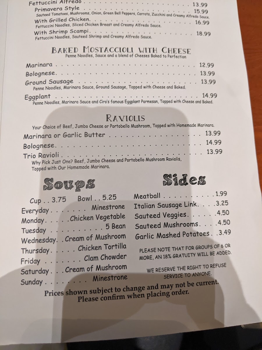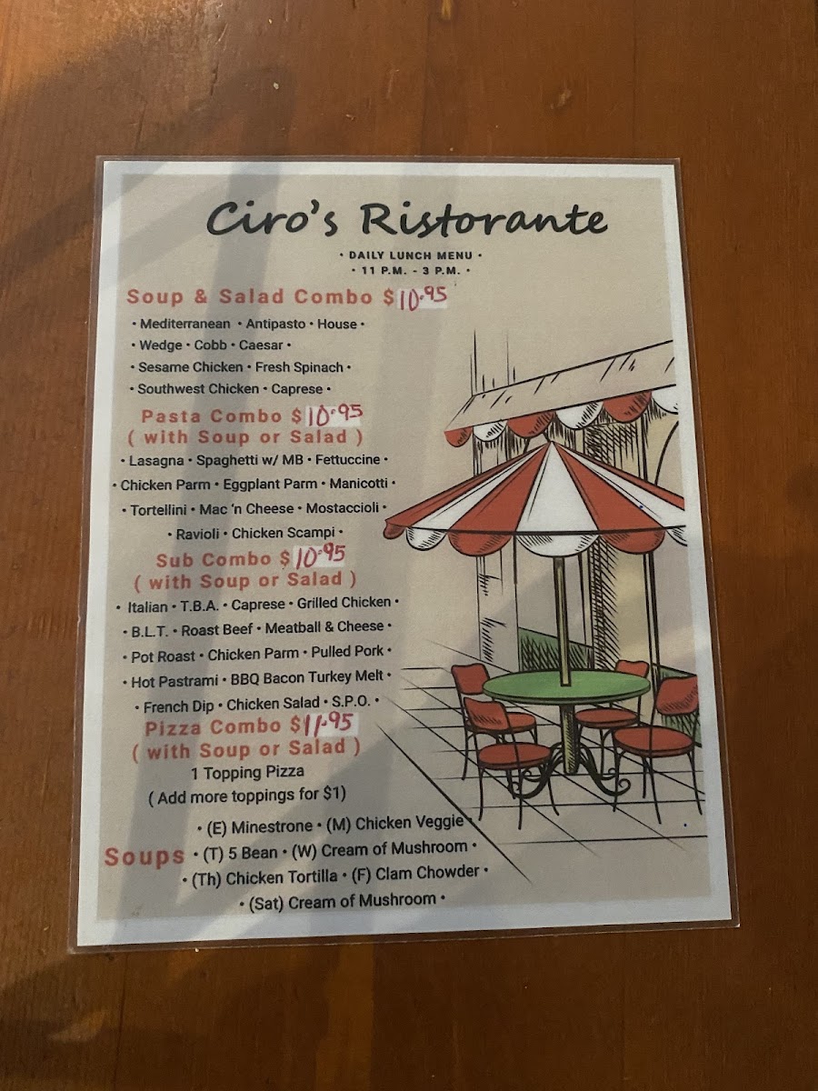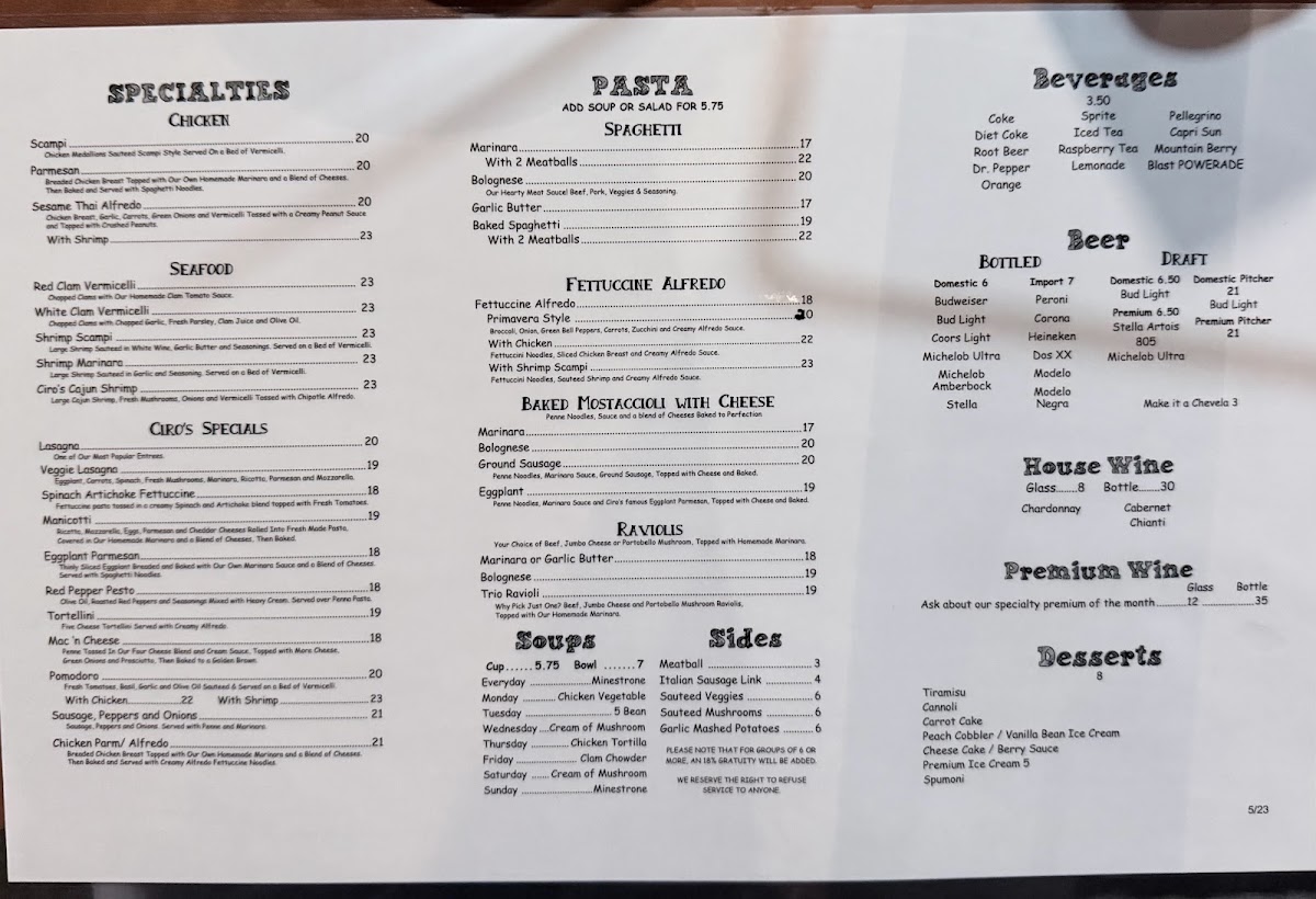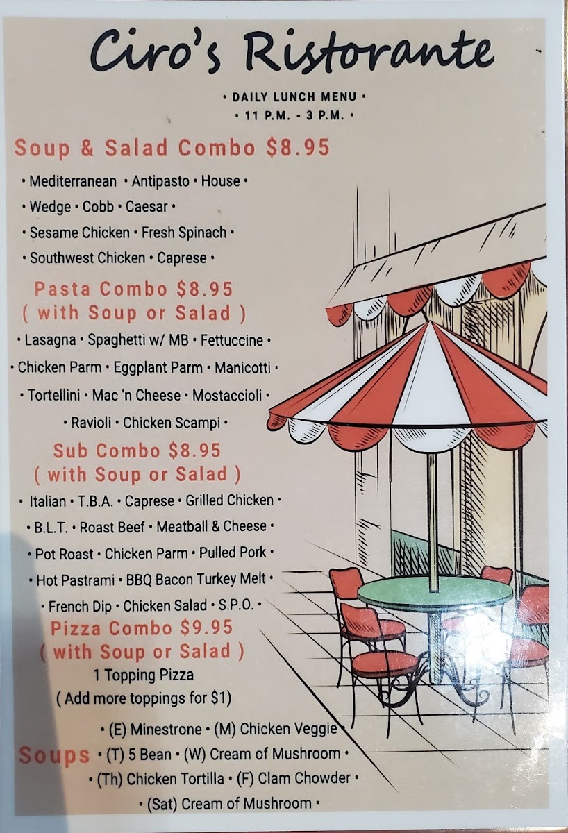 The menu at Ciro's Ristorante & Pizzeria embraces classic Italian comfort with a welcoming, casual vibe. It offers a range of familiar favorites alongside hearty, satisfying dishes that suit both a relaxed lunch or a cozy dinner setting. Whether you’re stopping by for a slice of pizza, a warm bowl of minestrone, or a plated pasta dish, the menu presents options that feel comforting and approachable.