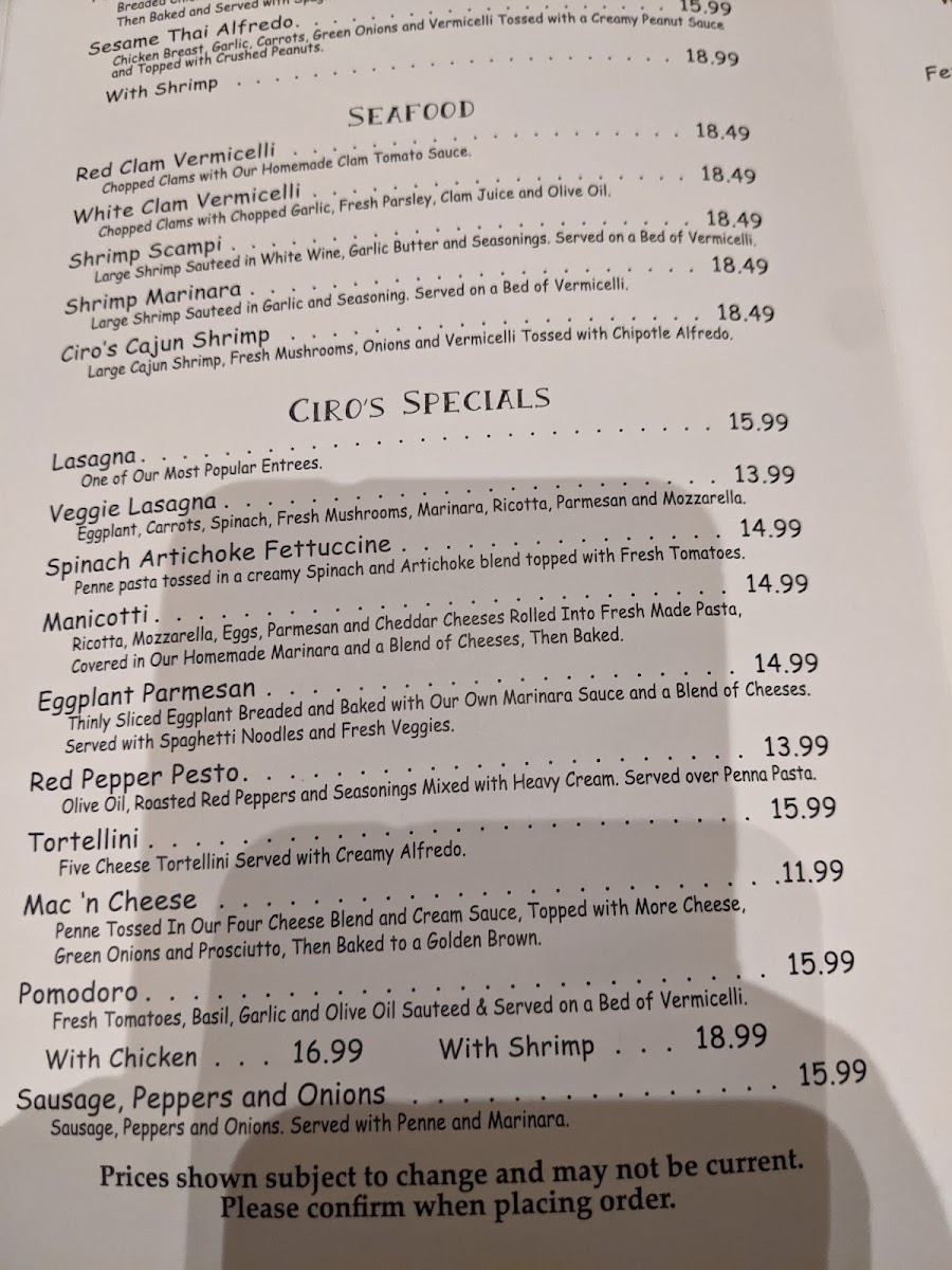 Whether you come for a quick bite or a leisurely meal, the balanced combination of classic Italian preparations and familiar flavors provides a consistently satisfying dining moment. The range of options also invites diners to explore something classic or a little different, fitting well within the warm and unpretentious setting that defines the overall experience at Ciro’s.